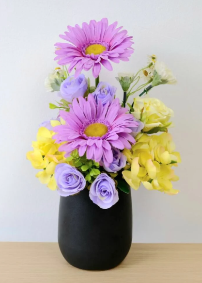 ดอกเยอบีร่าประดิษฐ์ผ้าในแจกัน สีม่วง/เหลืองชุดแจกันดอกไม้ประดิษฐ์ผ้า ดอกเยอบีร่าสีม่วง ดอกไฮเดรนเยียสีเหลือง เสมือนดอกไม้จริง สร้างบรรยากาศสดใส จัดในแจกันเซรามิกสีดำด้าน แข็งแรง ทนทาน ดีไซน์ทันสมัย มองได้รอบด้าน ขนาด กว้าง 20 ซม. ลึก 20 ซม. สูง 30 ซม. ทำความสะอาด เช็ดด้วยผ้าหมาด ปัดฝุ่น เหมาะสำหรับวางบนโต๊ะรับแขก โต๊ะทำงาน บนเคาน์เตอร์ ในร้านอาหาร คาเฟ่ เหมาะสำหรับมอบเป็นของขวัญ วันเปิดร้าน วันเกิด วิธีใช้งาน